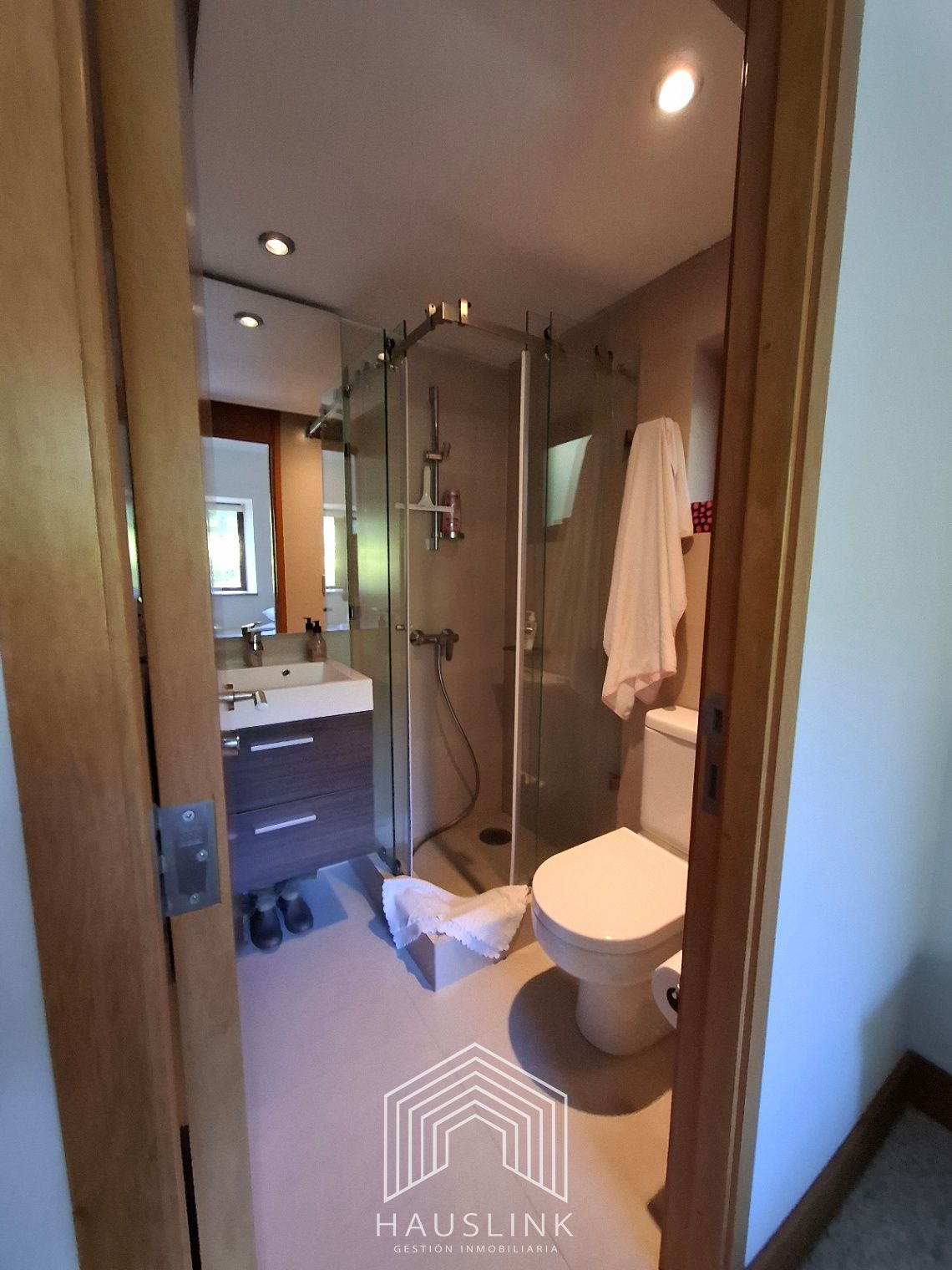 Baño principal con ducha de gran tamaño con mampara de vidrio templado