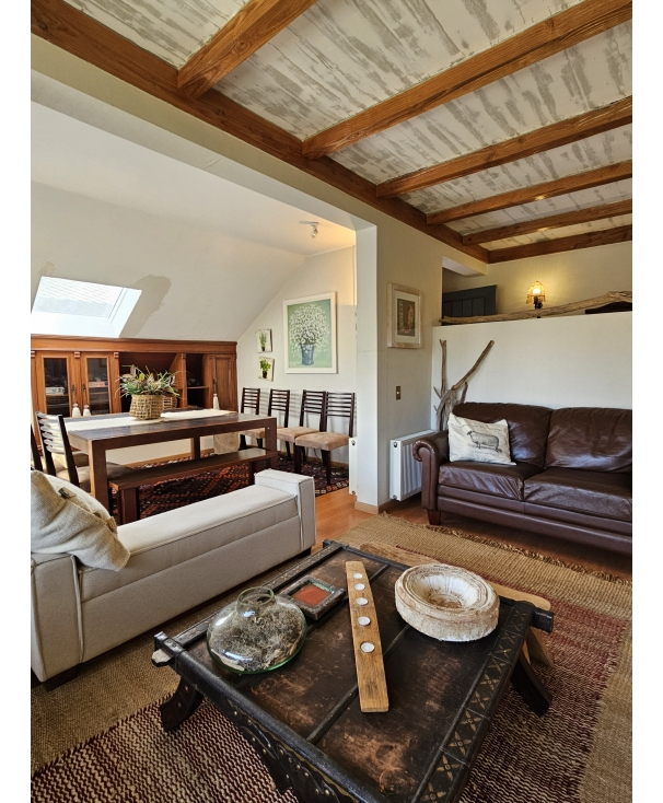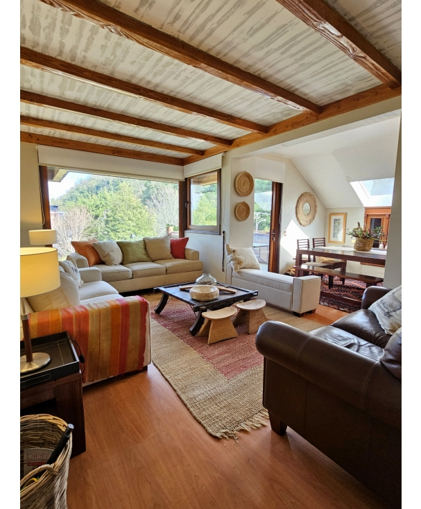 Amplio living-comedor con vigas a la visita, acogedores sillones, una vista maravillosa, sumamente iluminado ya que cuenta con tragaluz Velux. Comedor con salida a terraza.